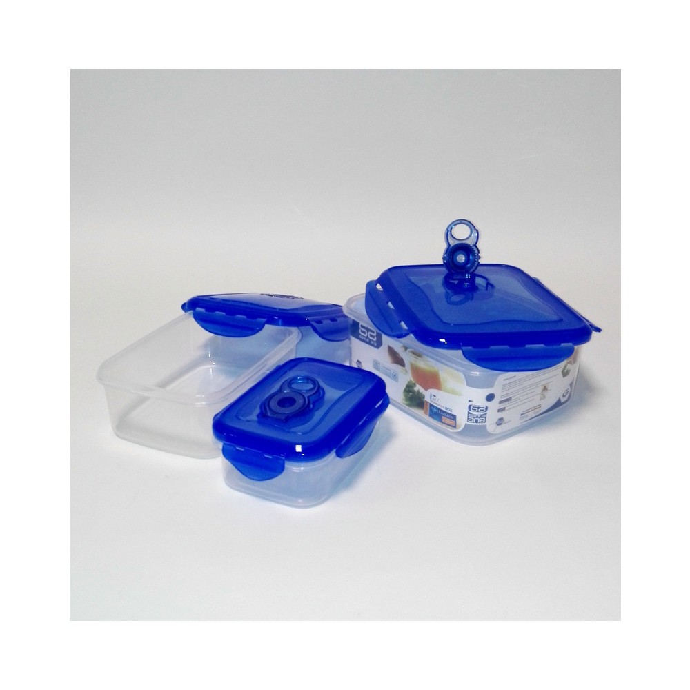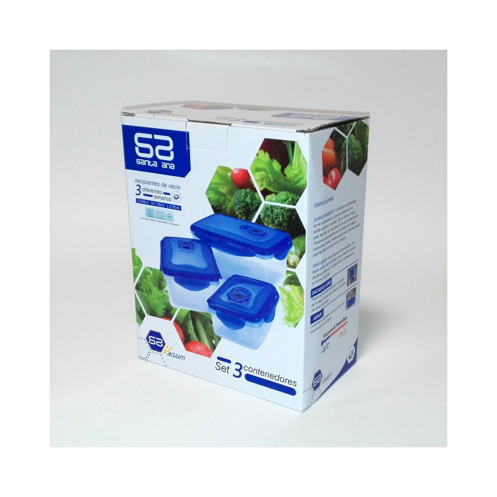 PP + Silicona seal. Set de 3 contenedores para frigorífico con sistema de vacío para mejor conservación de los alimentos. Sistema sencillo: hace vacío simplemente presionando varias veces la tapa y para abrir solo hay que levantar la anilla de la tapa antes de soltar las pestañas laterales. Aptos para frigorífico, congelador, microondas y lavavajillas. Tamaños: L: 22,2 × 17,4 × H9,8 cm - 2150 ml M: 19 × 14,4 × H7,5 cm - 1150 ml S: 16 × 11,6 × H6 cm - 500ml