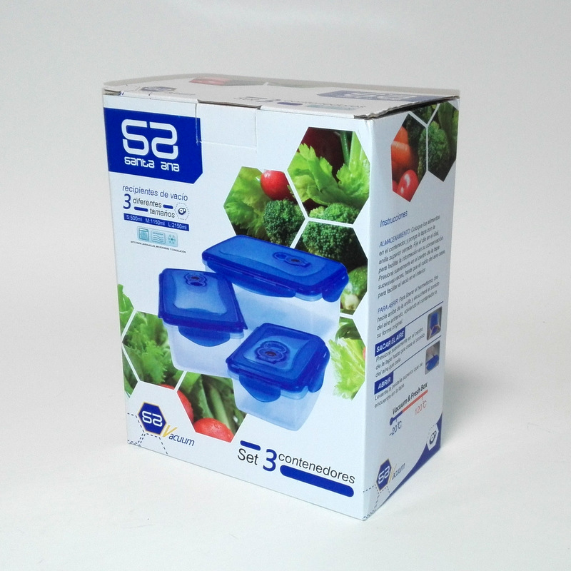 PP + Silicona seal. Set de 3 contenedores para frigorífico con sistema de vacío para mejor conservación de los alimentos. Sistema sencillo: hace vacío simplemente presionando varias veces la tapa y para abrir solo hay que levantar la anilla de la tapa antes de soltar las pestañas laterales. Aptos para frigorífico, congelador, microondas y lavavajillas.