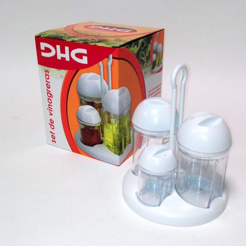 Soporte de plástico fácil de transportar: Contiene: 1 aceitera,1 vinagrera,1 salero,1 especiero.