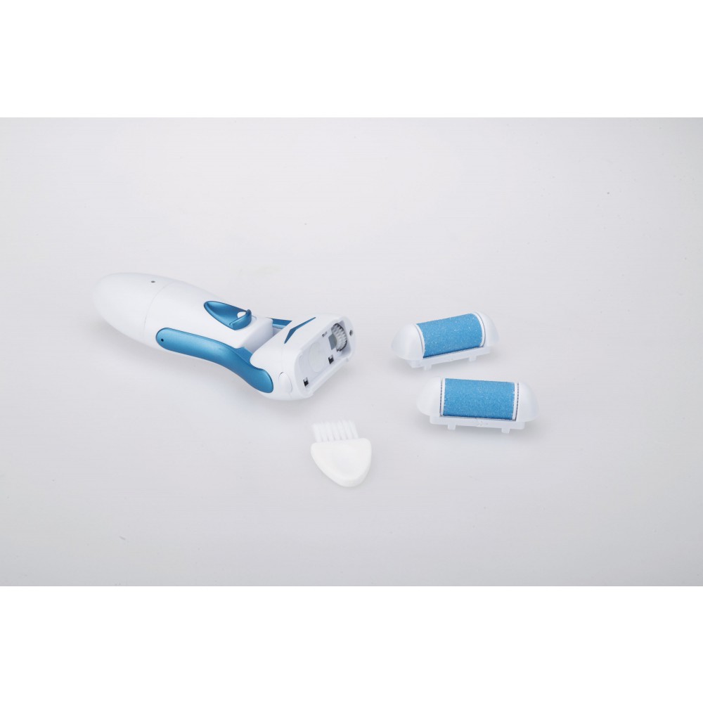 Protegido contra proyecciones de agua (IPX4). Rotación suave y eficaz. Cabezal extraíble para fácil limpieza. Interruptor de encendido. Lavable. Cepillo para limpieza. 2 rodillos limadores incluidos. Protector de rodillos. Diseño ligero y ergonómico. Funciona con 2 pilas “AA” de 1,5 V (no incluidas).