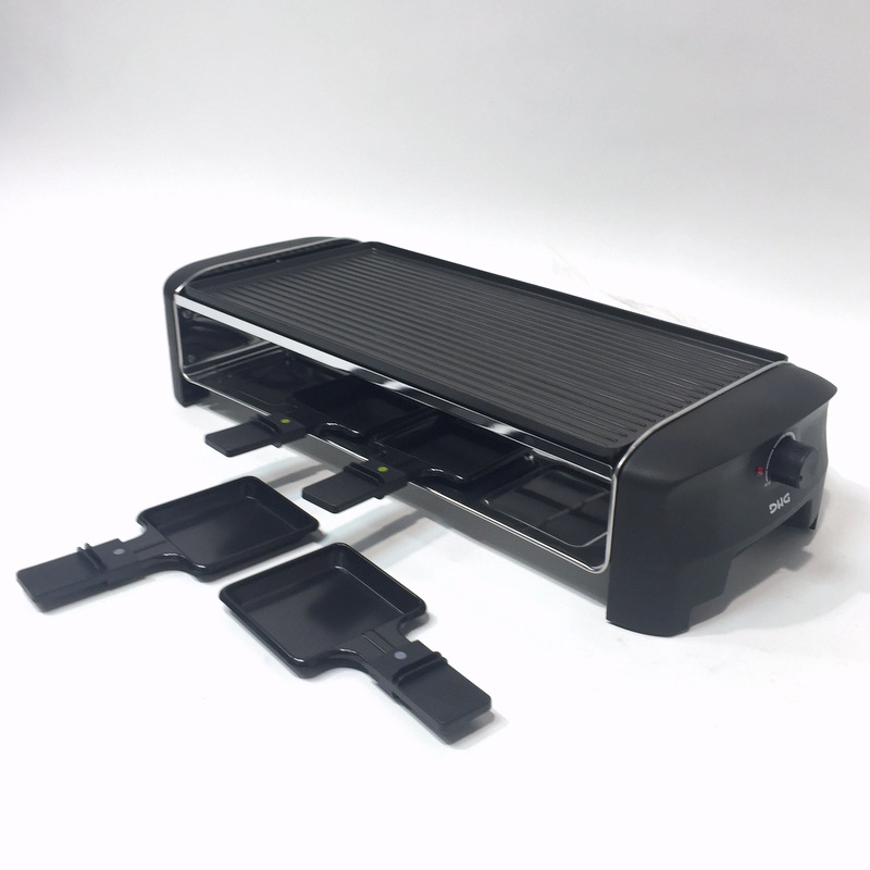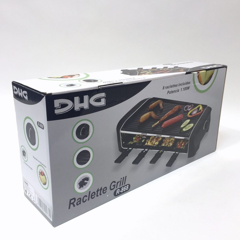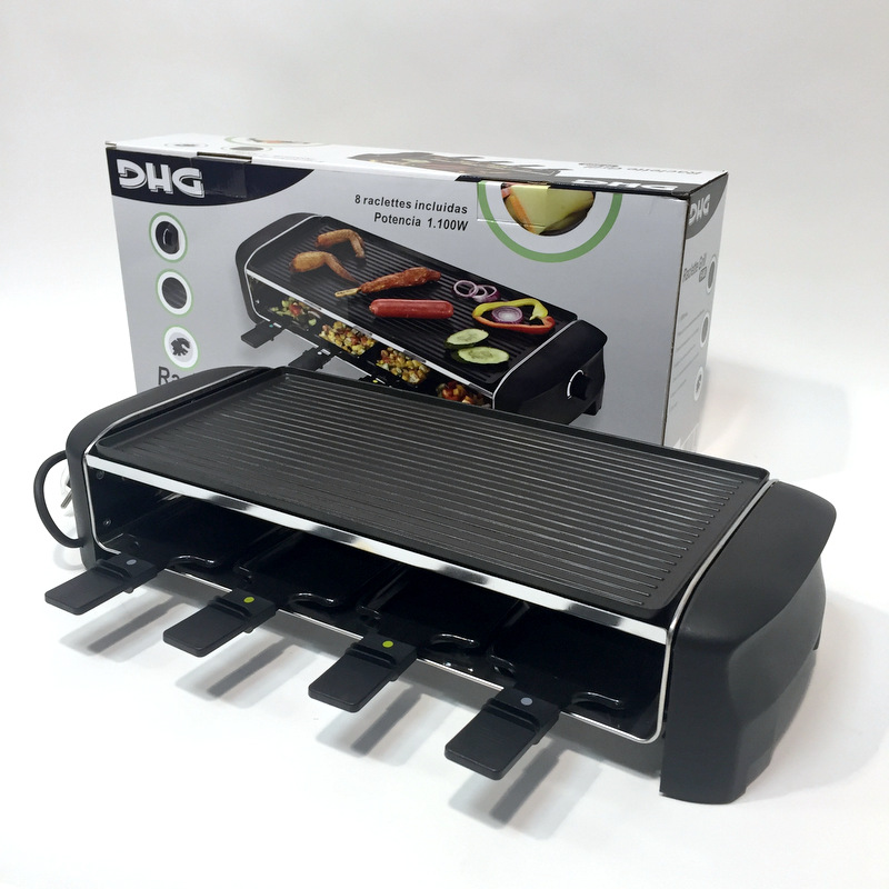 1.100W max. Incluye 8 raclettes antiadherentes. Placas grill con revestimiento antiadherente. Control de temperatura con indicador. Zona de calentamiento inoxidable. Apoyos antideslizantes. Color negro
