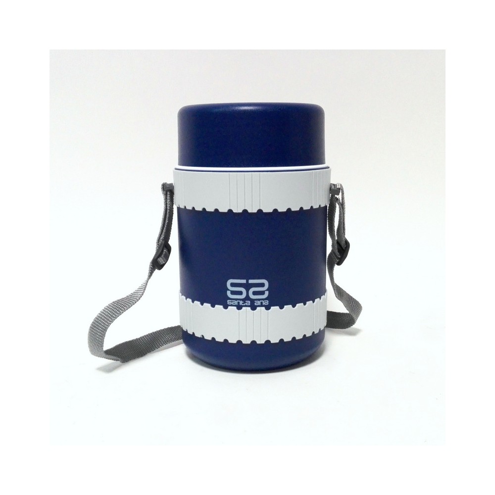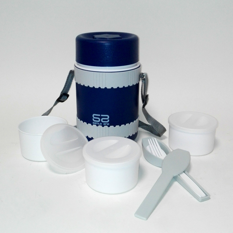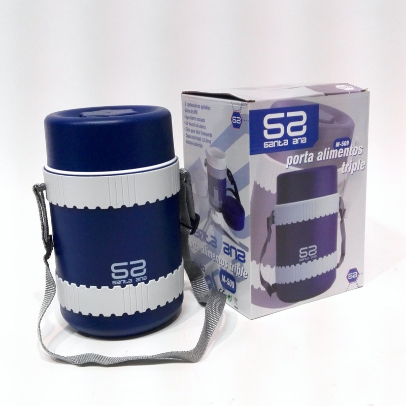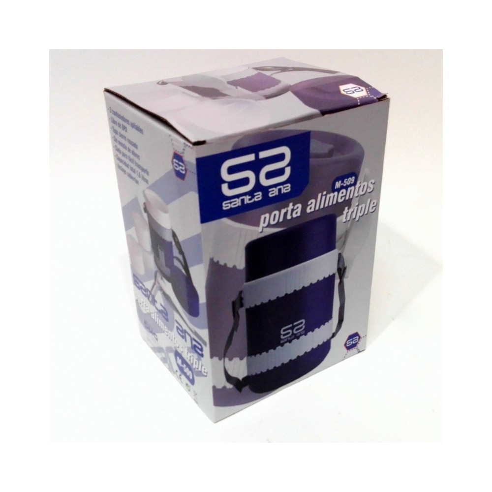 Marca Santa Ana. Porta alimentos con tres contenedores individuales con tapa. Set de cubiertos con su funda. Tapa superior. Asa para facilitar su transporte. Material plástico. Capacidad total 1,8 litros.