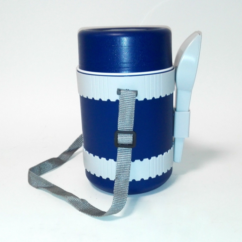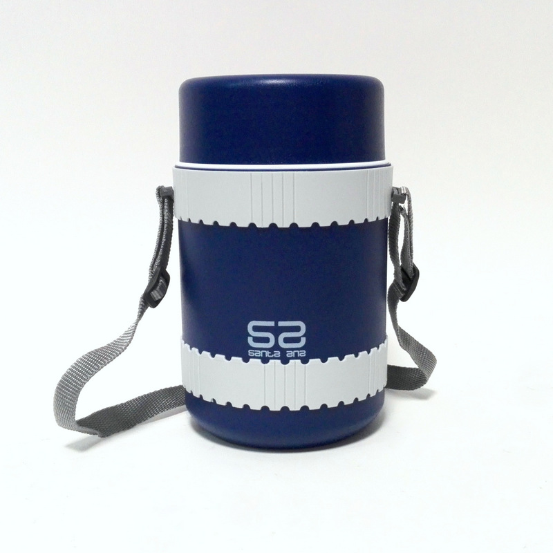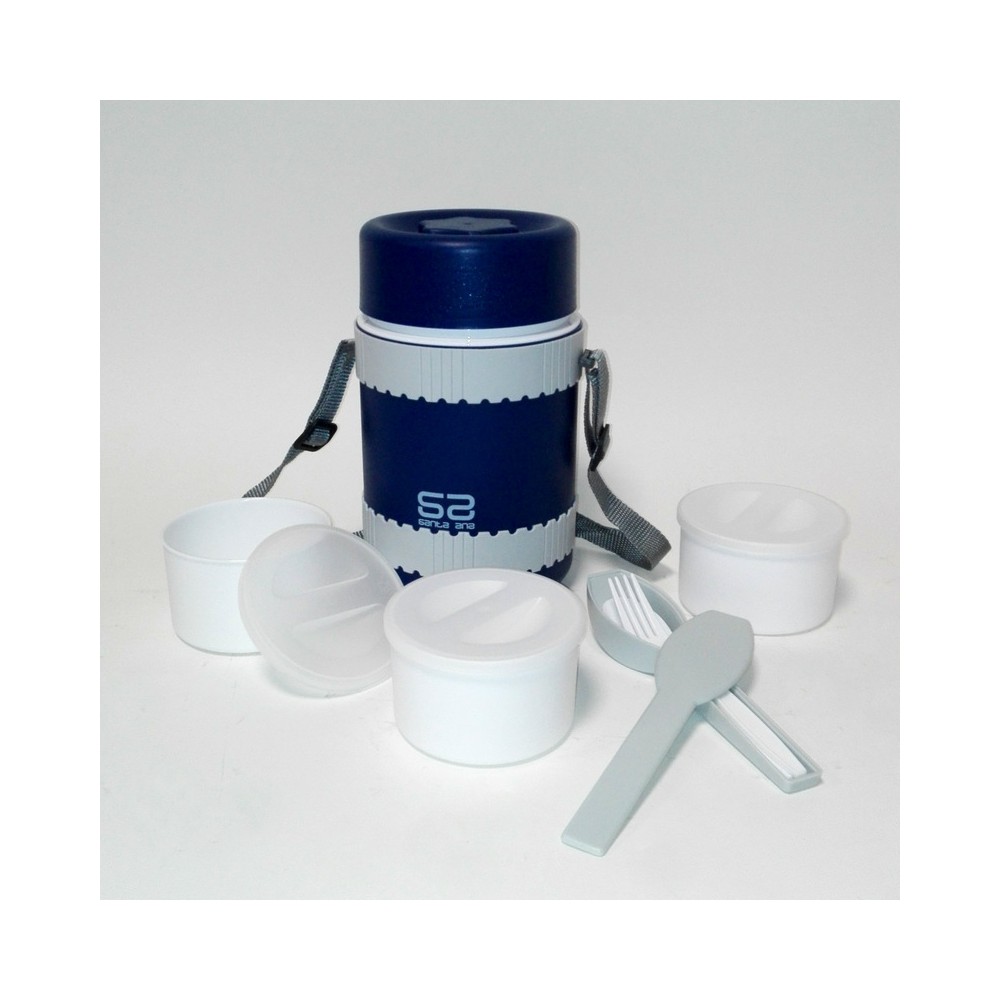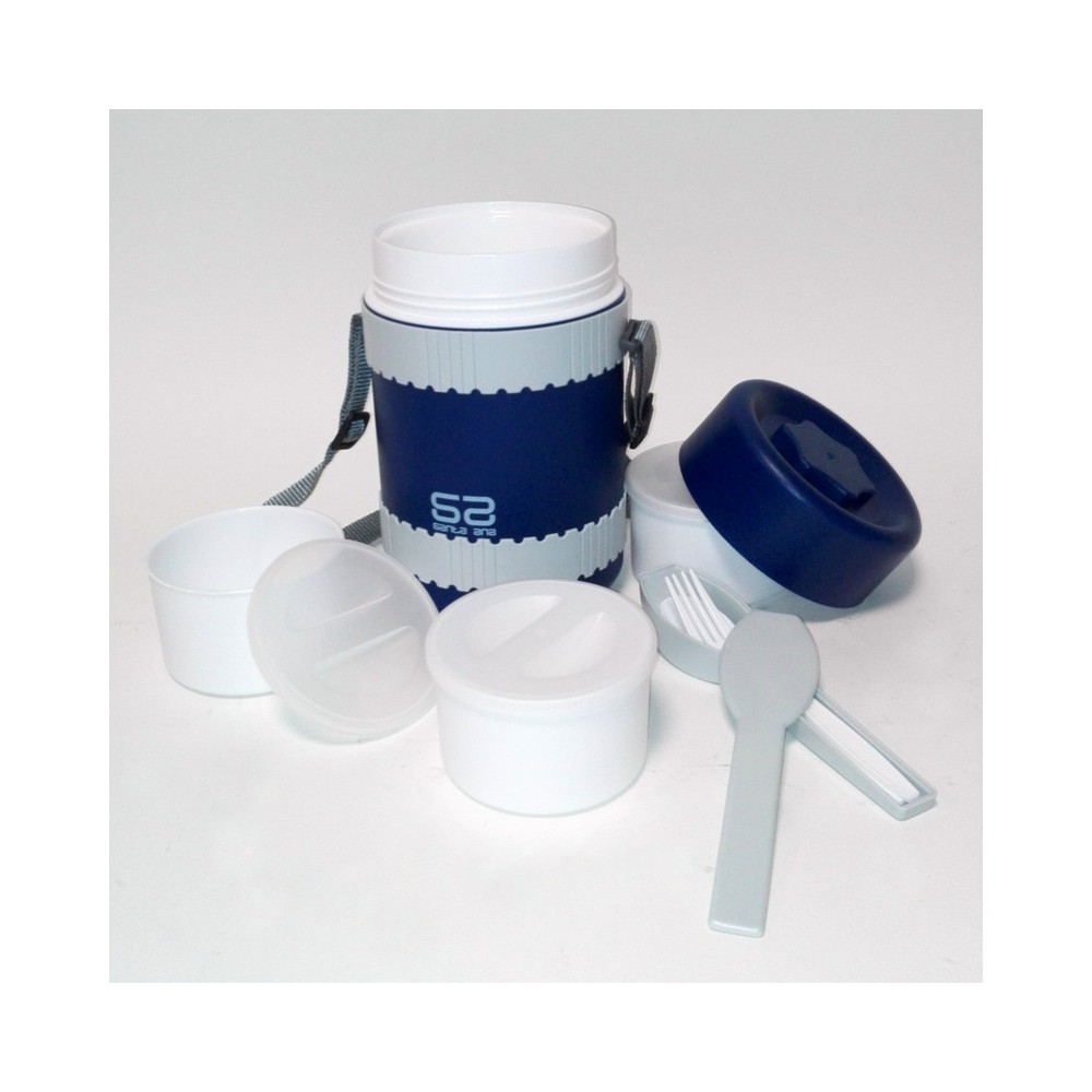 Marca Santa Ana. Porta alimentos con tres contenedores individuales con tapa. Set de cubiertos con su funda. Tapa superior. Asa para facilitar su transporte. Material plástico. Capacidad total 1,8 litros.
