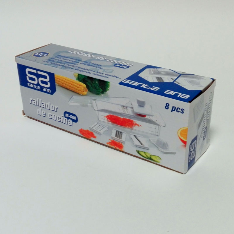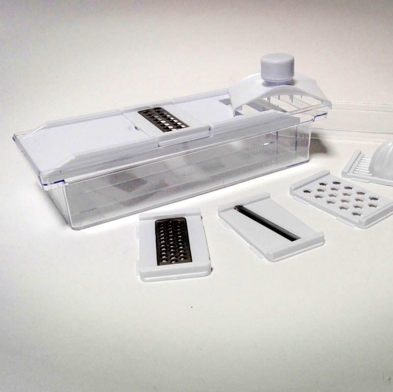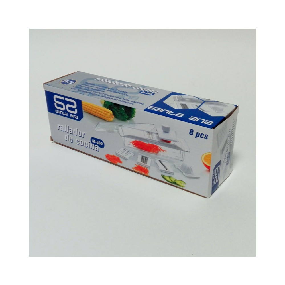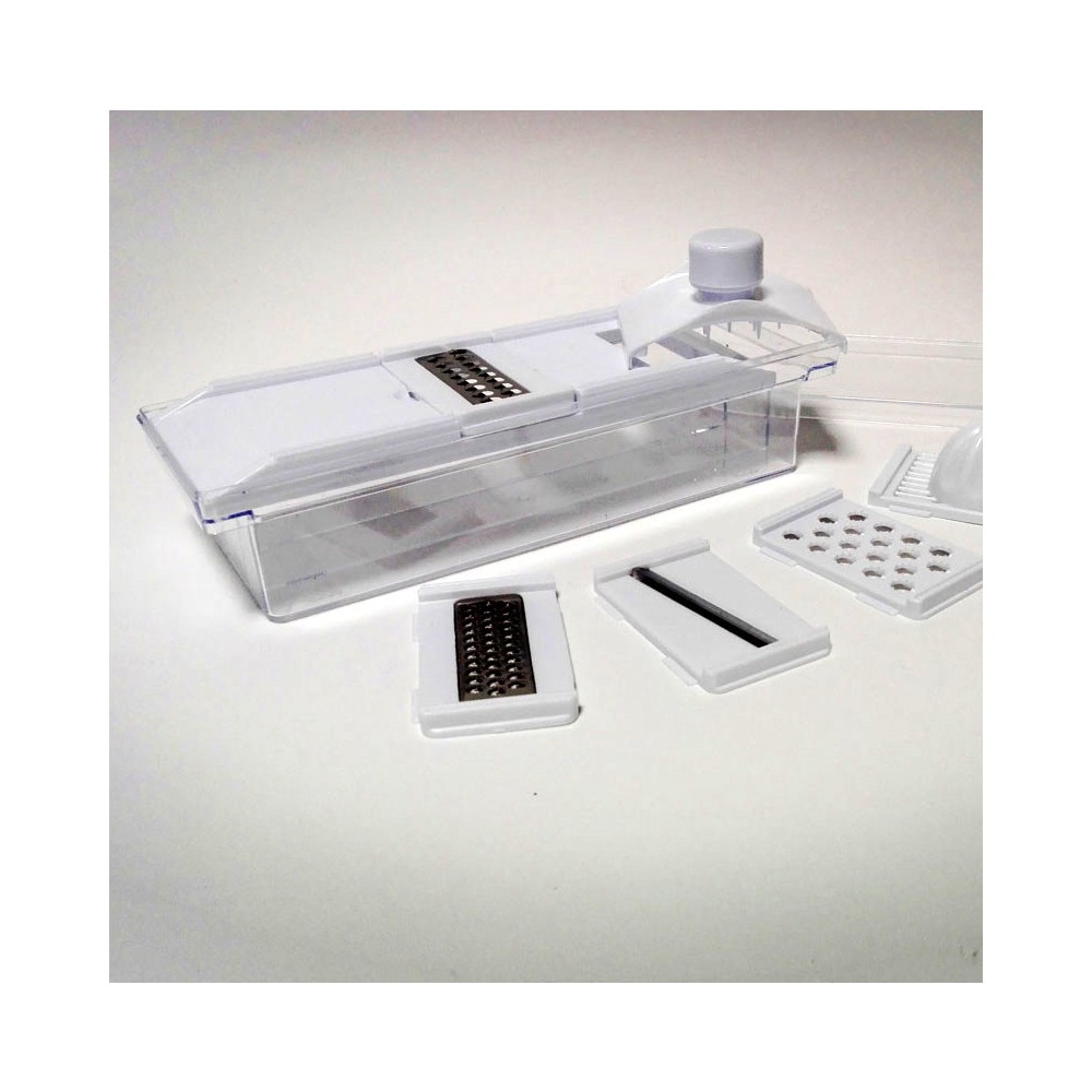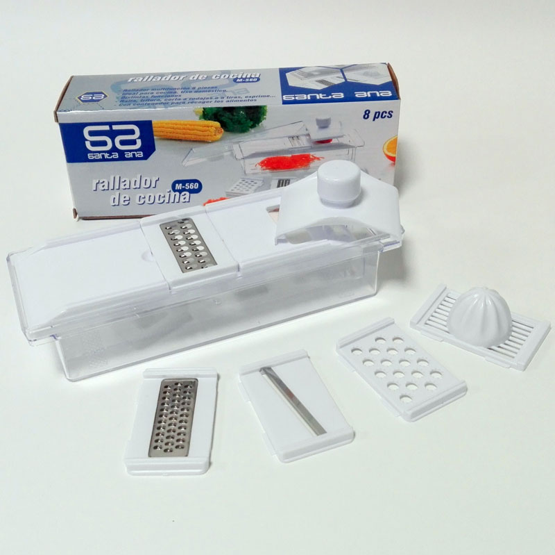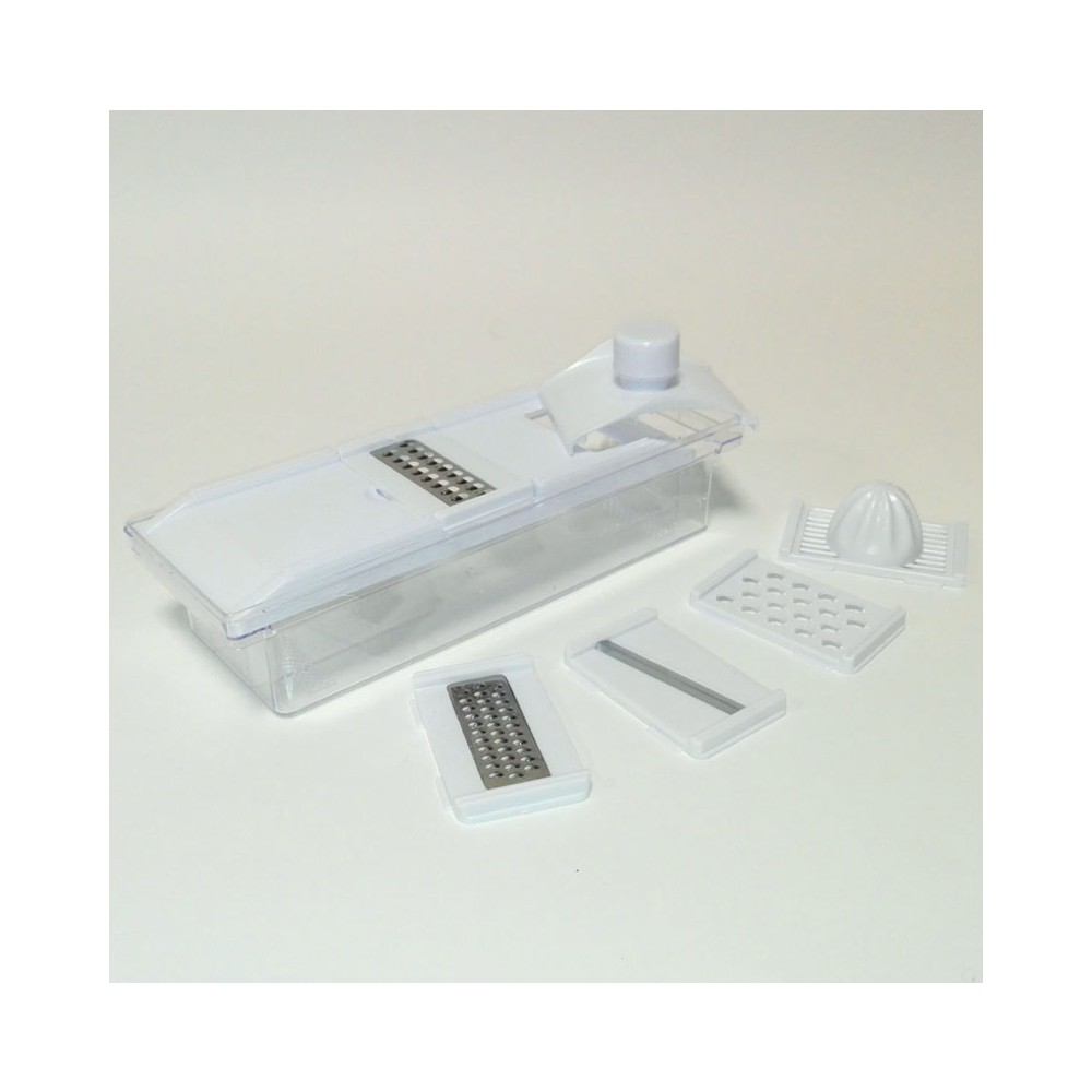 Set compuesto de 8 piezas para varias funciones: rallar, triturar, cortar, hacer zumos. Contiene recipiente para recoger los alimentos.