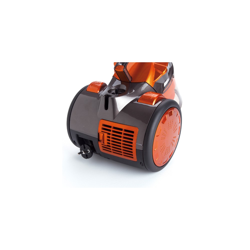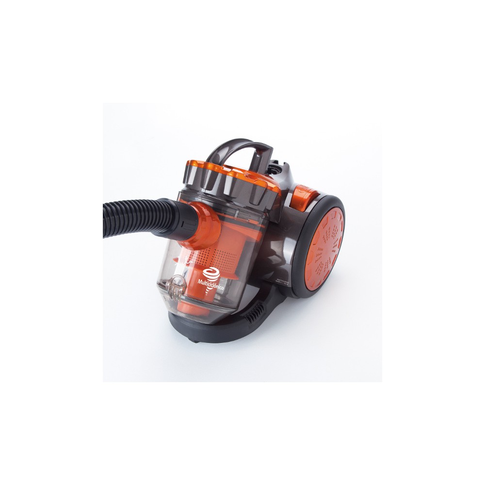 Eficiencia Energética (EU): A. Máxima succión, sin pérdida de aire. Sin bolsa. Sistema de filtrado multiciclónico. Filtros lavables. Filtros anti-ácaros, bacterias, polen, etc. Caudal de aire: 20,3 L/seg. Sonoridad <85 dB. Radio de acción: 6 metros. Tubo telescópico de acero inoxidable. Cepillo para todo tipo de suelos. Boquilla para juntas con cepillo integrado. Capacidad del depósito 2 litros. Pulsador puesta en marcha. Recogecable automático. Asa de transporte. Voltaje 230 V. Potencia 700 W (Clase A).