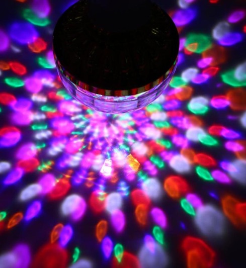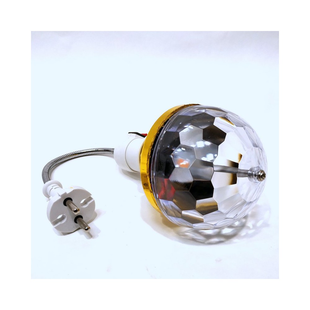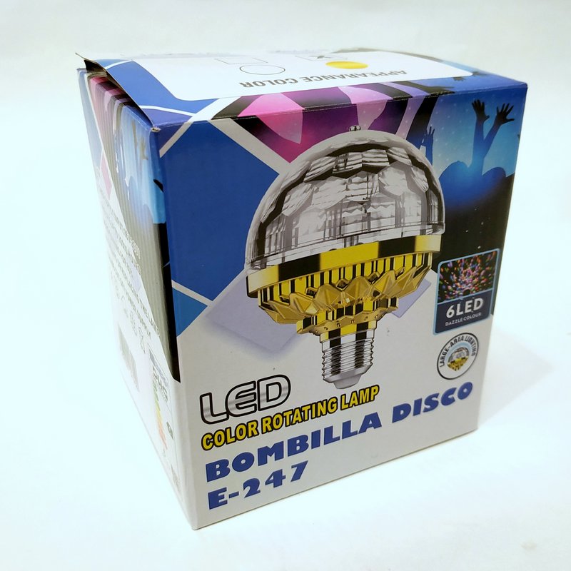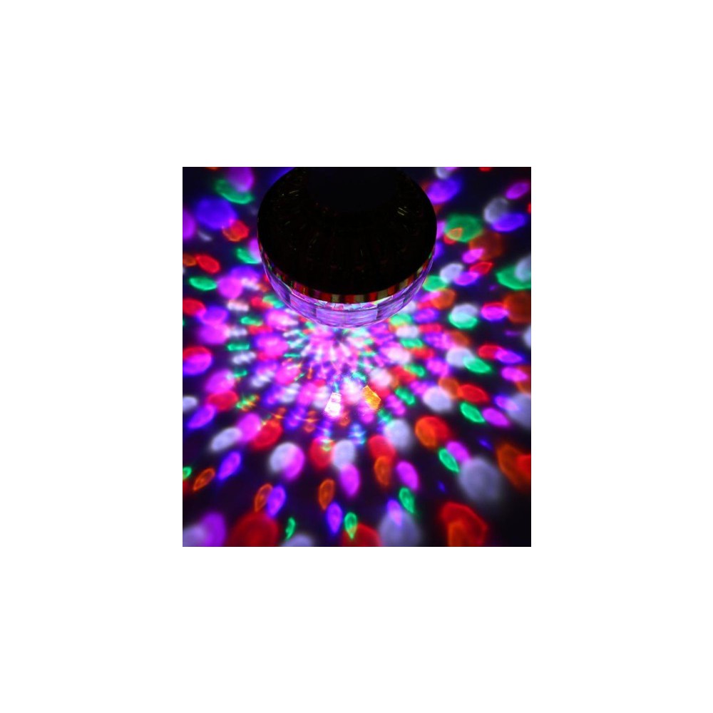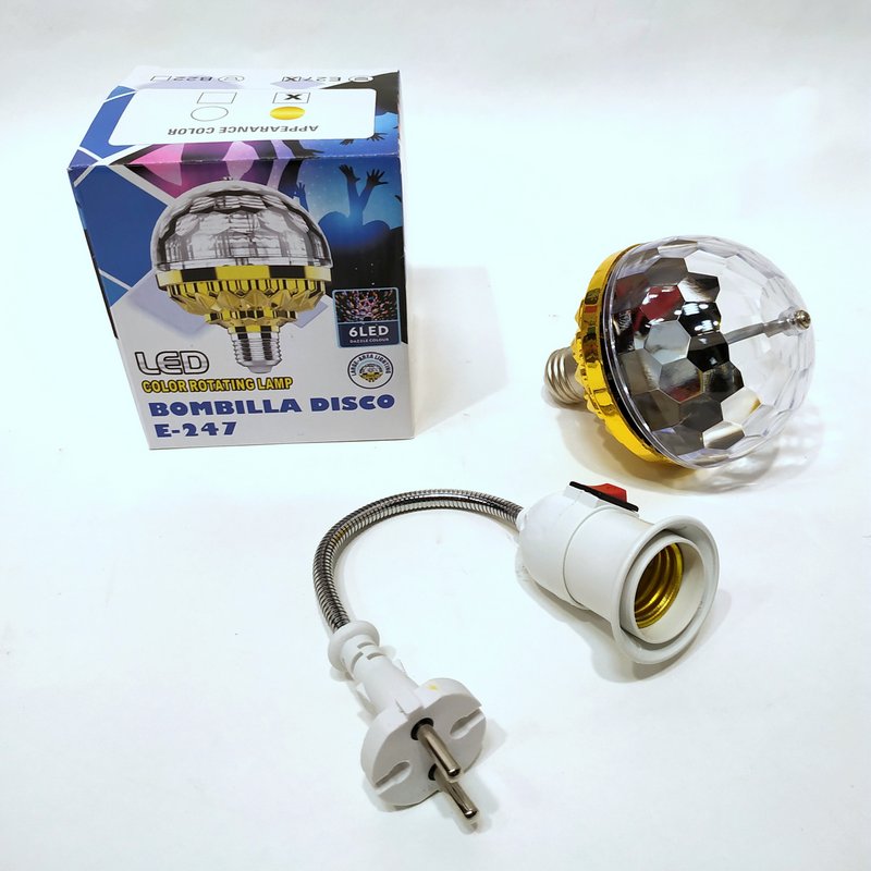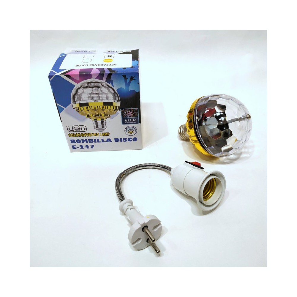 Bombilla efecto discoteca con luces LED de múltiples colores. Función giratoria 360grados. Incluye adaptador directo a enchufe con interruptor.