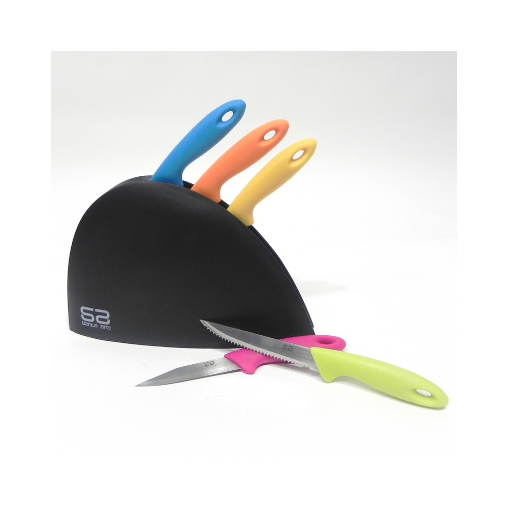 - Mango de vistosos colores y filo de acero inoxidable.