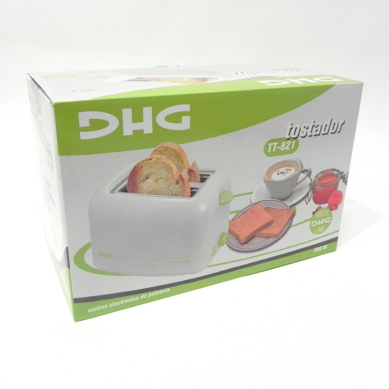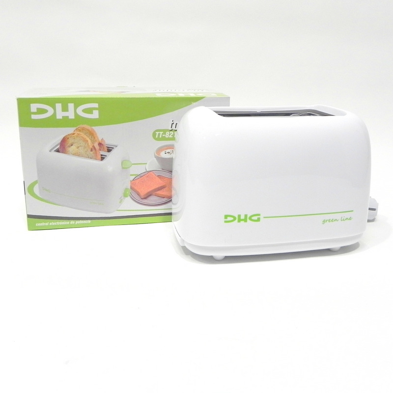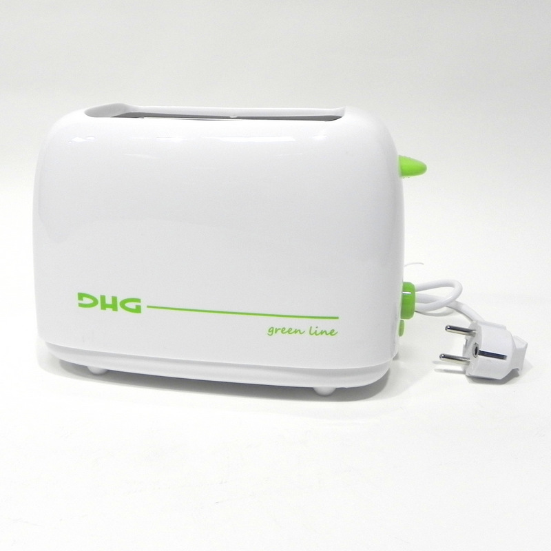Tostador marca DHG de la línea Green Line. Tamaño compacto y elegante diseño. Doble ranura y bandeja para las migas. Hasta 6 niveles de tostado y botón de parada.