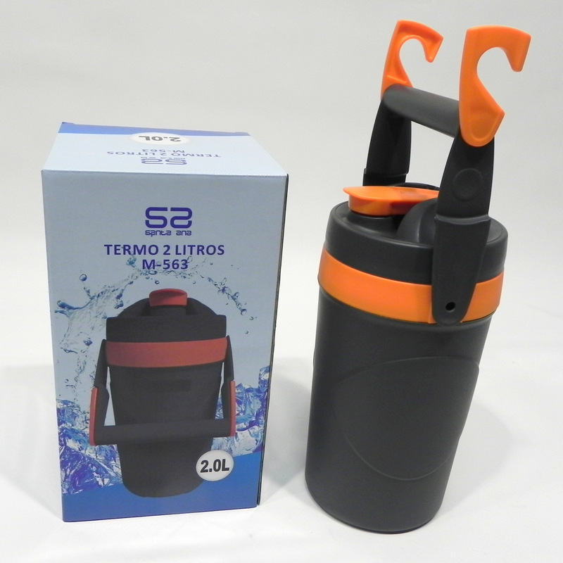 Termo de material plástico. Tapa de rosca de amplia abertura y capacidad de 2 litros. Con asa para facilitar su transporte.