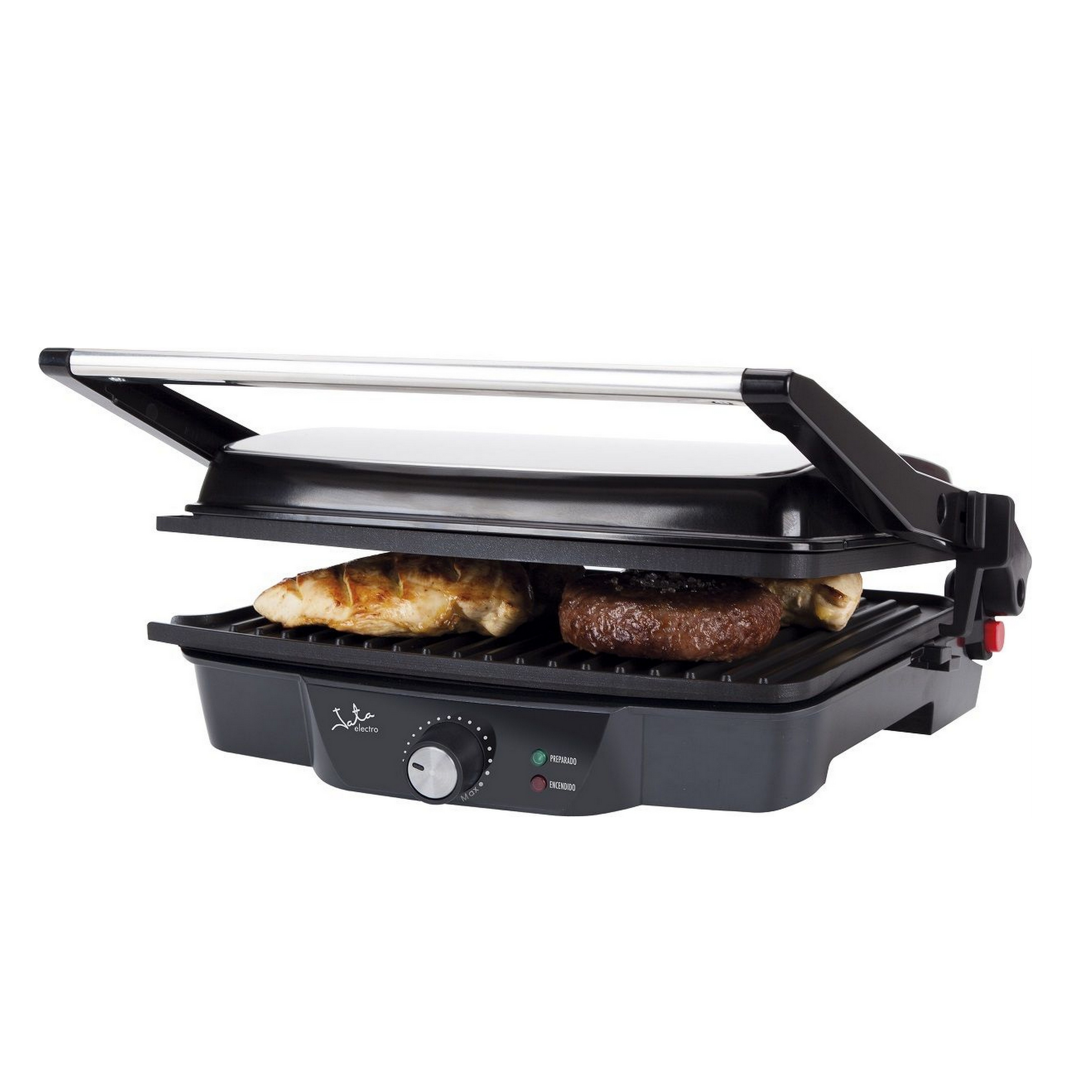 - Placa superior basculante con 2 niveles, especial para hamburguesas, entrecot, sándwiches y pescados.