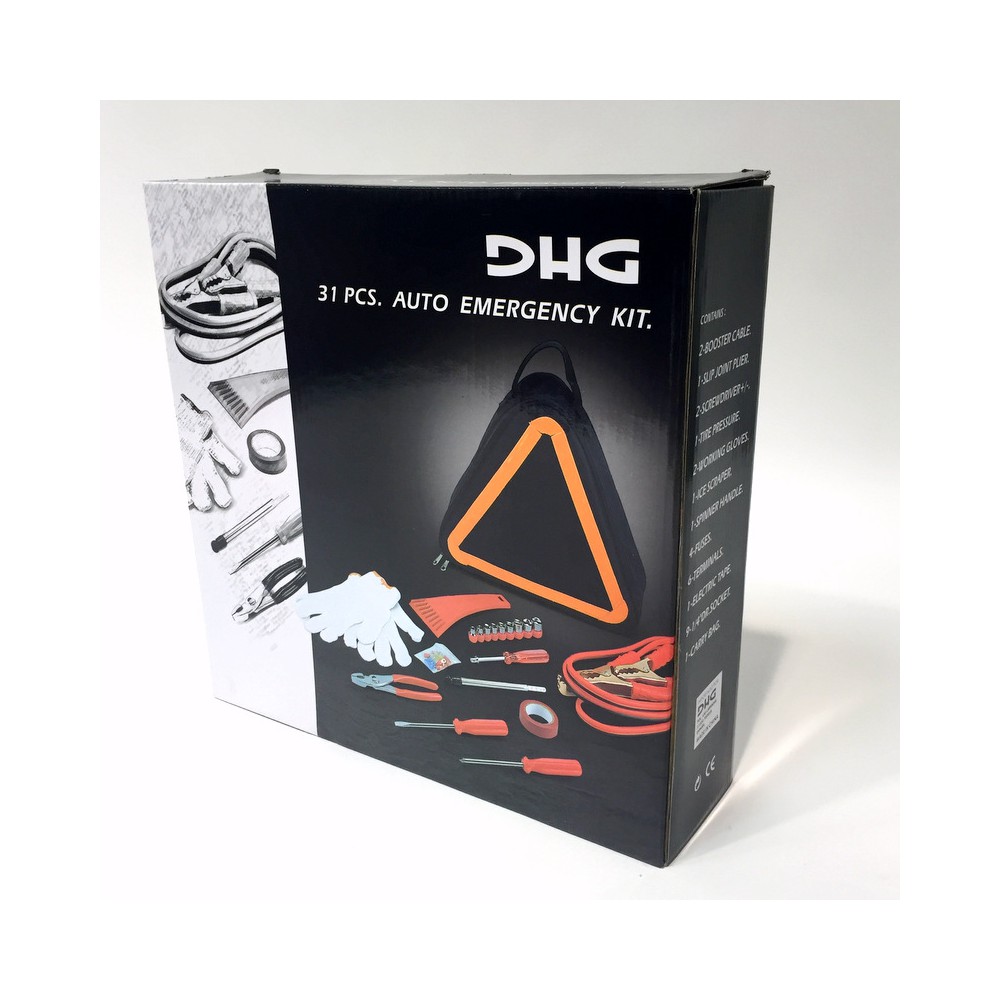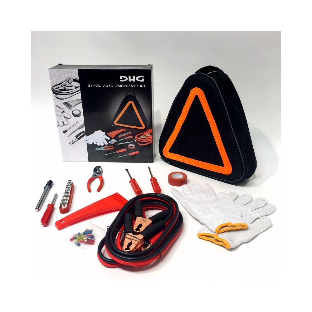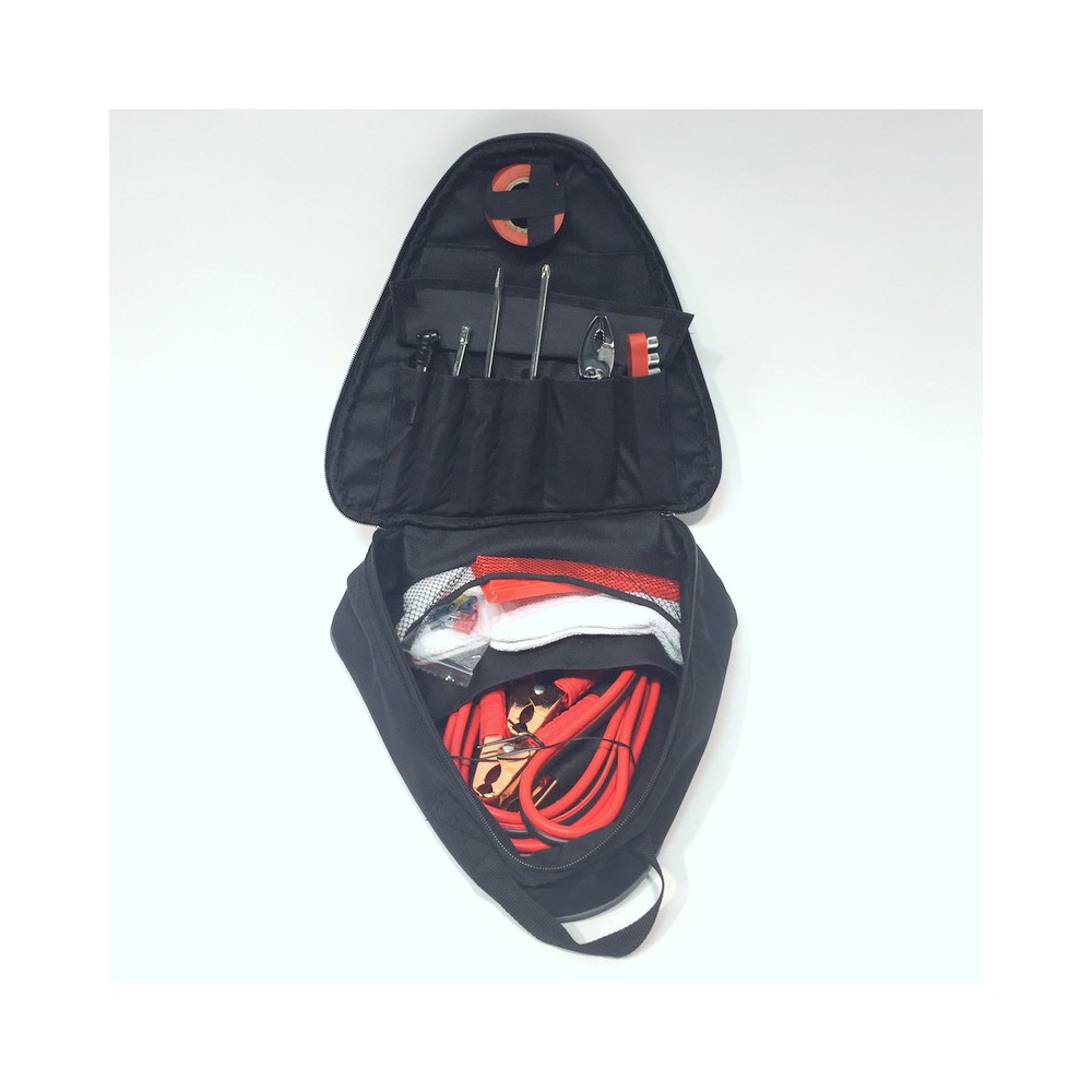 Bolsa para guardar herramientas incluida. Contiene: Pinzas para batería.Destornilladores.Guantes.Alicates.Mango y llaves de carraca.Fusibles.Cinta aislante